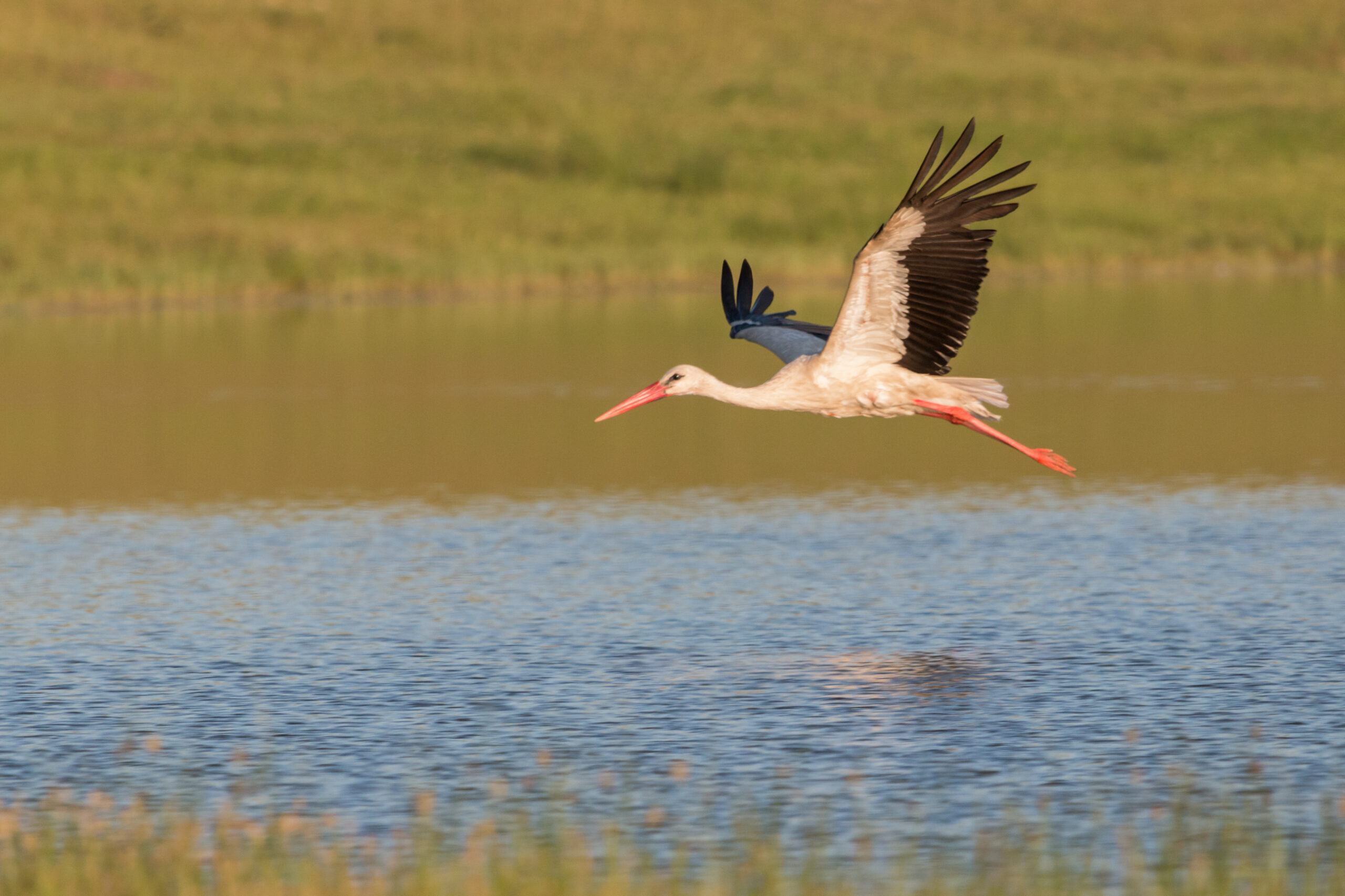 Ein Storch fliegt in der Abendsonne über einen See